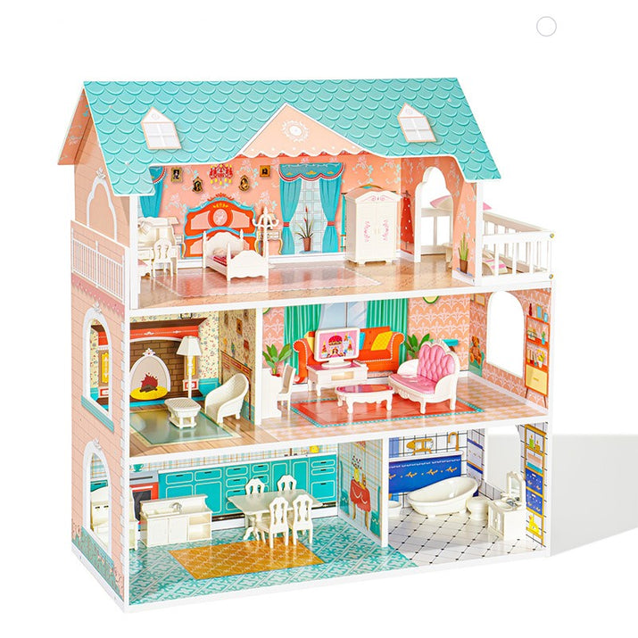 This elegant dollhouse features three stories and multiple rooms, crafted from sturdy wood and complete with rich, solid furniture. Its detailed construction makes it both durable and enchanting for children.