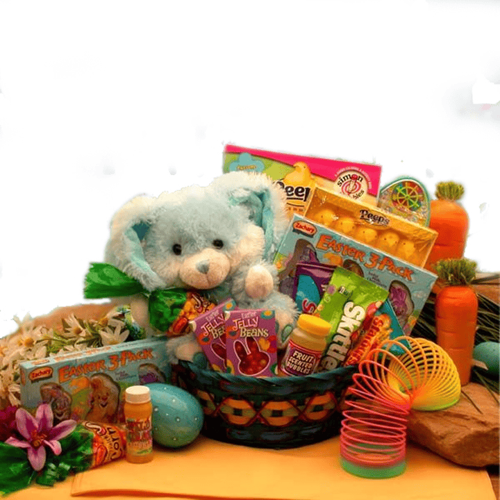 The Bunny Hugs Easter basket includes: 8" plush Easter Bunny in your choice of boy or girl colors, Easter Peeps, 35 page full size Peeps coloring book, fruit flavored bubbles, Jelly beans, 3 milk chocolate bunny pals, pastel magic spring, Nerds candies, spring fruit flavored Skittles, Starburst fruit gels, and a 3 pc candy necklace gift set. A carrot patch bag of candy corn wrapped in cellophane and topped with a handmade springtime bow.
